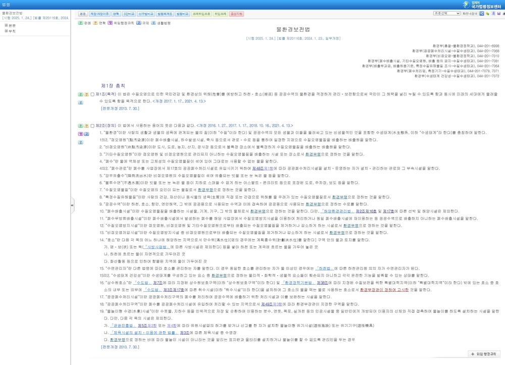 주요 내용: 물환경보전법 본문과 함께 시행령, 시행규칙 등 최신 법령 정보를 제공.
