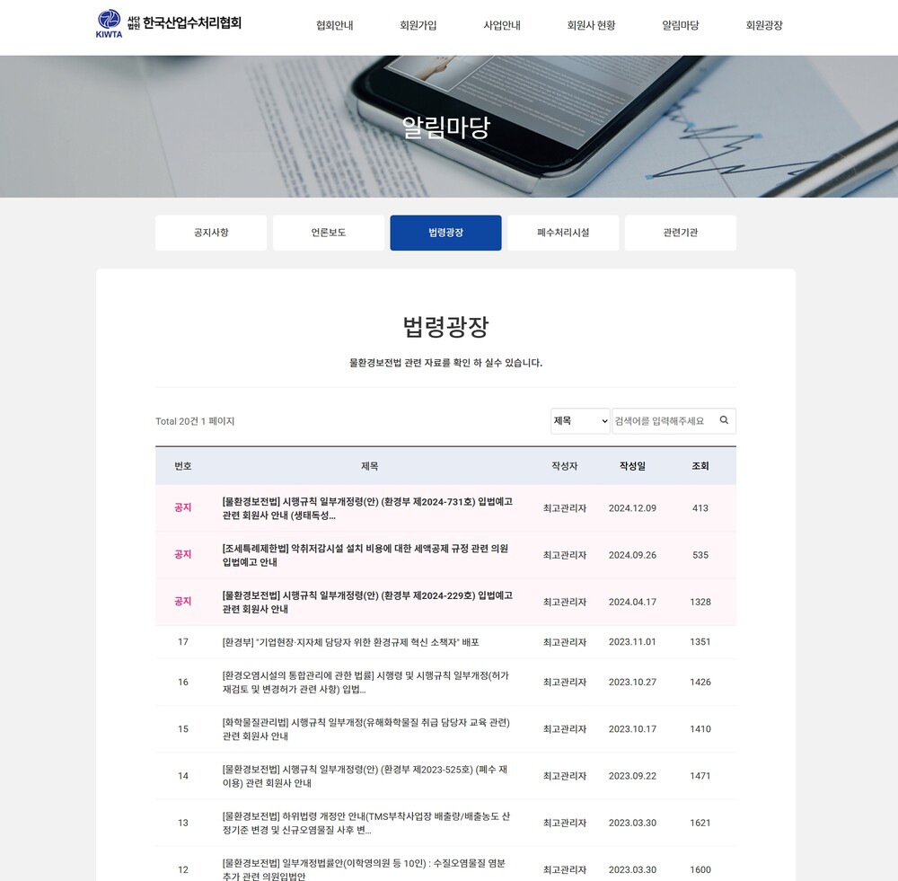 특징: 폐수처리업체 및 관련 기업을 위한 실무 자료와 최신 법령 정보를 확인.