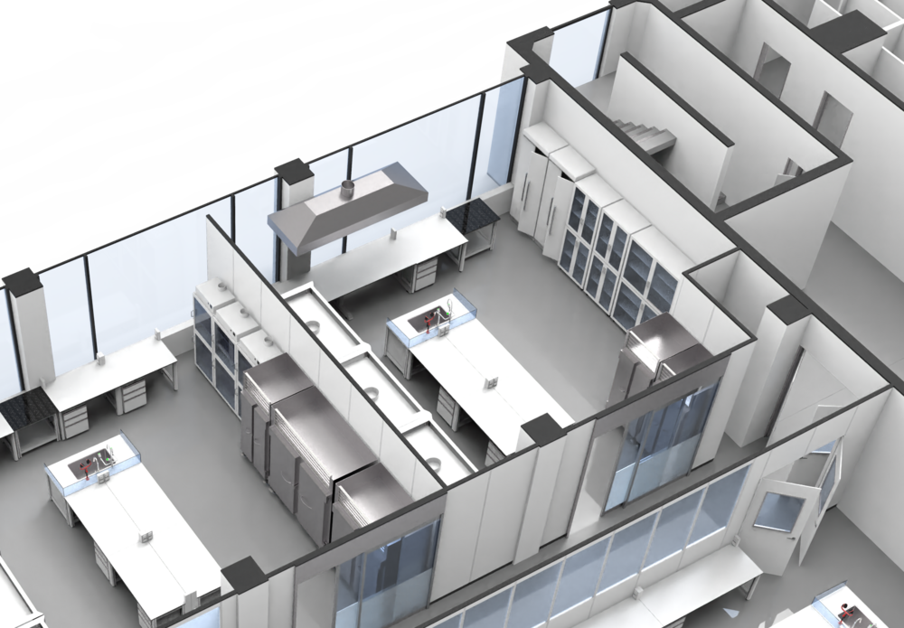 실험대 상부, 세척실, 용기 세정공간, 주방, 열기 방출 장비 위