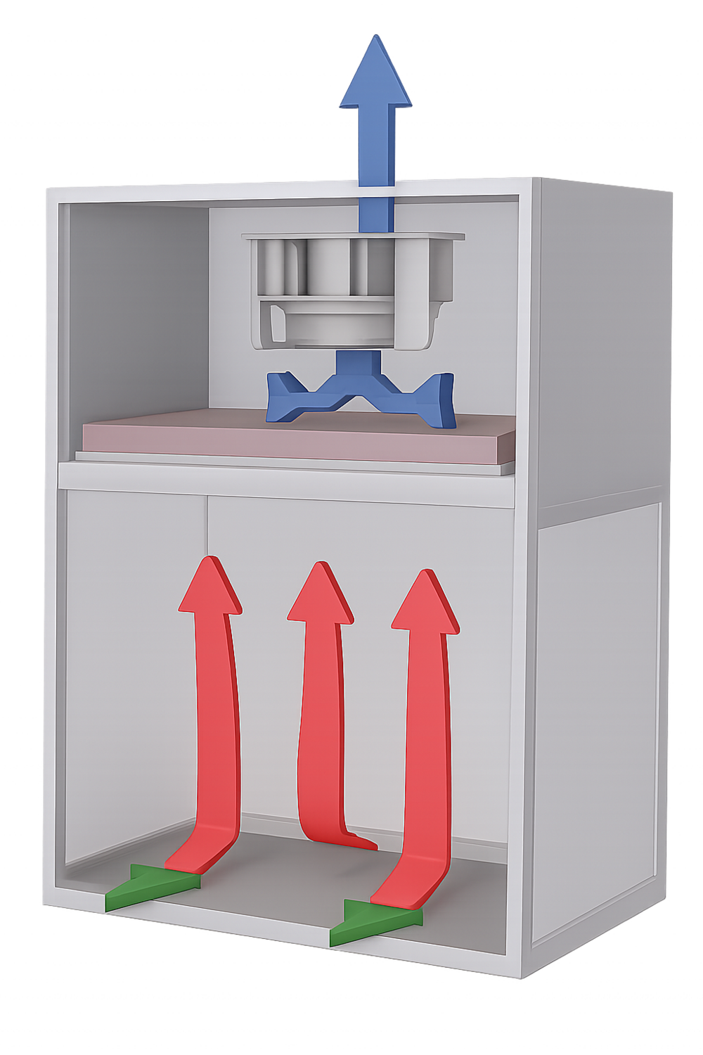 ์คํ์๊ฐ ์์นํ ํ๋ ์ ๋ฉด ๊ฐ๊ตฌ๋ถ์์ ๋ด๋ถ๋ก ์ ์ ๋๋ ๊ณต๊ธฐ ์๋. ๋ํ๋ฏผ๊ตญ ๊ถ์ฅ ๊ธฐ์ค: 0.4 ~ 0.6 m/s (์ฝ 80 ~ 120 fpm)