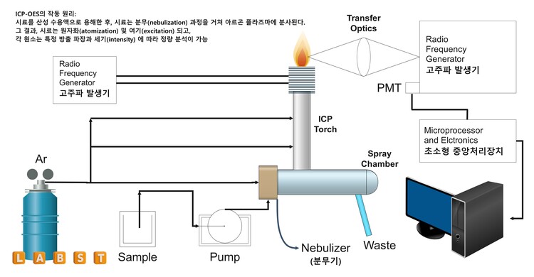 ICP-OES는 유도결합플라즈마 방출분광분석기로, 고온의 플라즈마에 시료를 주입해 원자화 및 여기(excited) 상태로 만든 뒤 방출되는 광(Emission)을 측정하여 원소의 종류와 농도를 분석하는 장비.