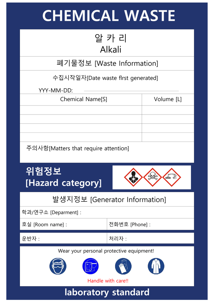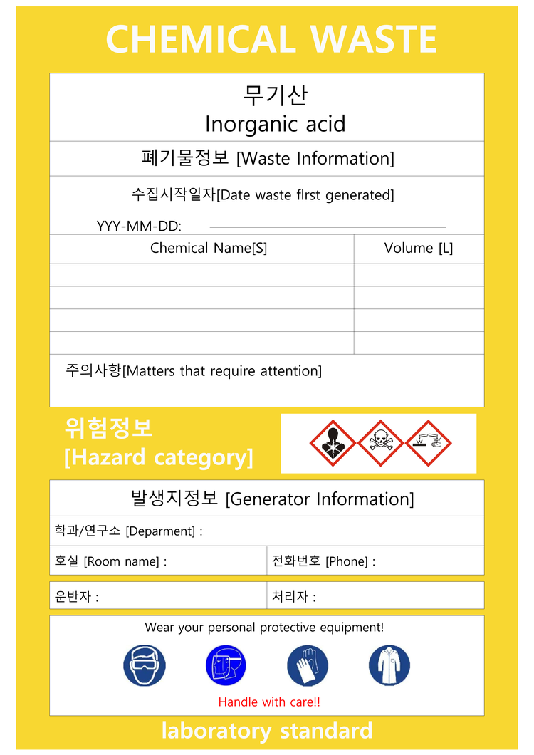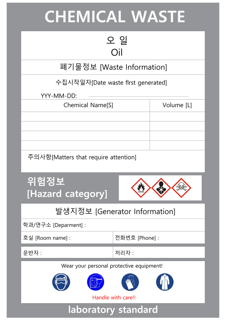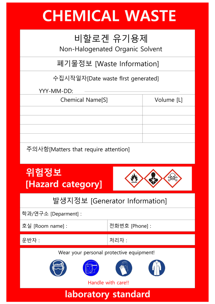 ํํ ๋ฌผ์ง ํ๊ธฐ๋ฌผ์ ํ๊ธฐ๋ฌผ ๋ฐ์์ง์์ ๋ถ๋ฅ๋๊ณ , ์ ์ ํ ์ฉ๊ธฐ์ ๋ด์ ๋ผ๋ฒจ๋ง ๋ฐ ๋ณด๊ด๋จ.