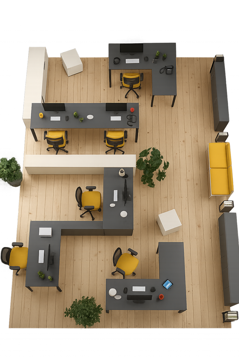 Optimize space to accommodate various functions such as team collaboration, individual work, meeting rooms, and break areas.