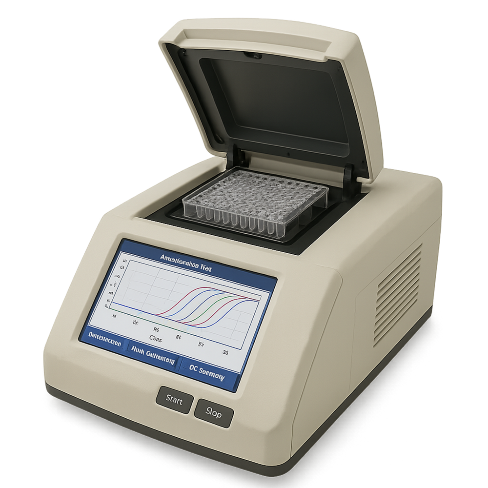 [온도조절 블록] + [광원 (LED, Halogen)] → [필터] → [형광 검출기 (PMT or CCD)] → [소프트웨어 분석]