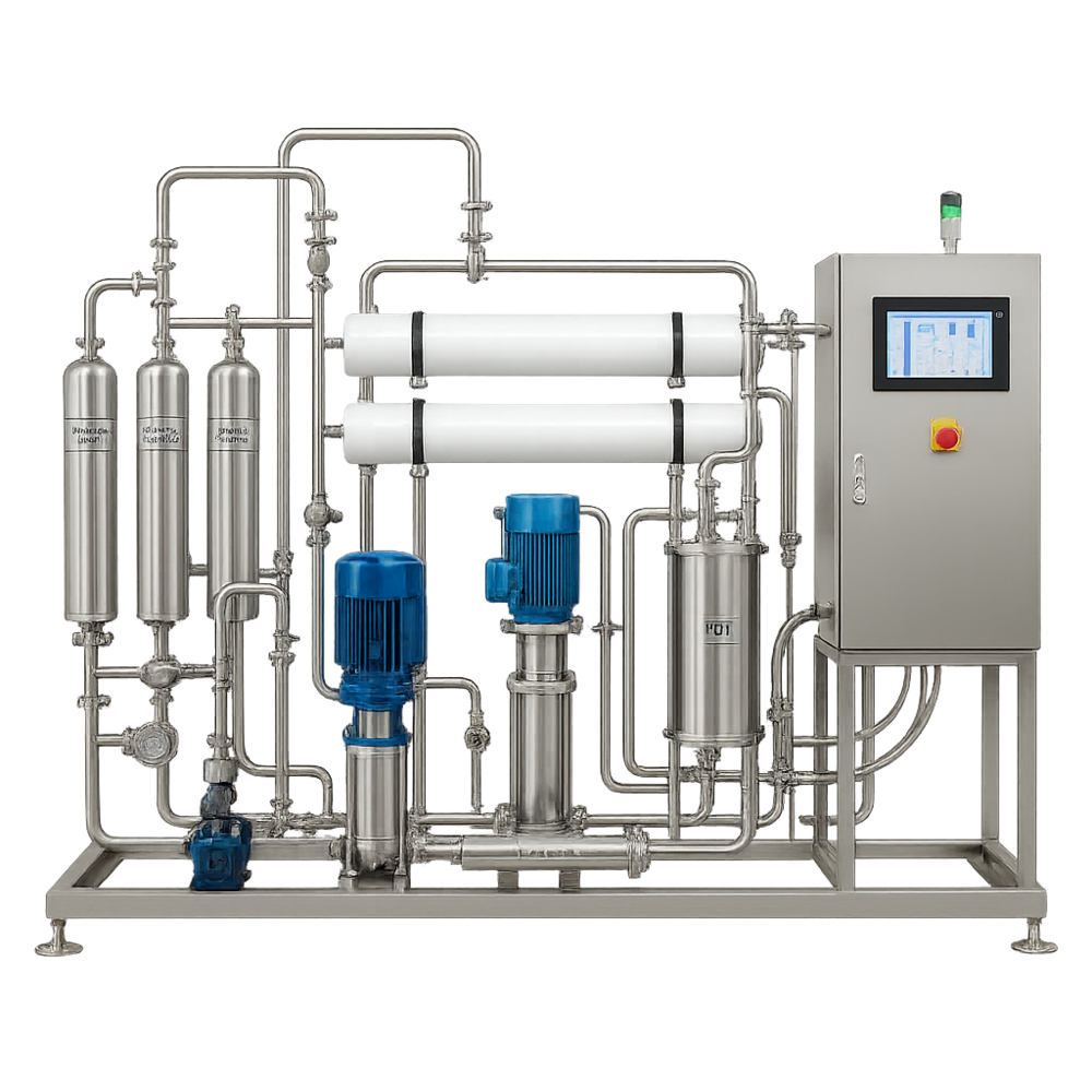 정제수(PW): 전처리 → RO → (2차 RO/EDI) → 탱크·순환루프(살균/필터)