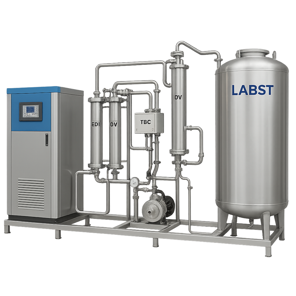 RO/DI/EDI 뒤에 폴리싱(185/254 nm UV, 활성탄, 0.2 μm/UF 필터, 혼합층 수지)을 통과.